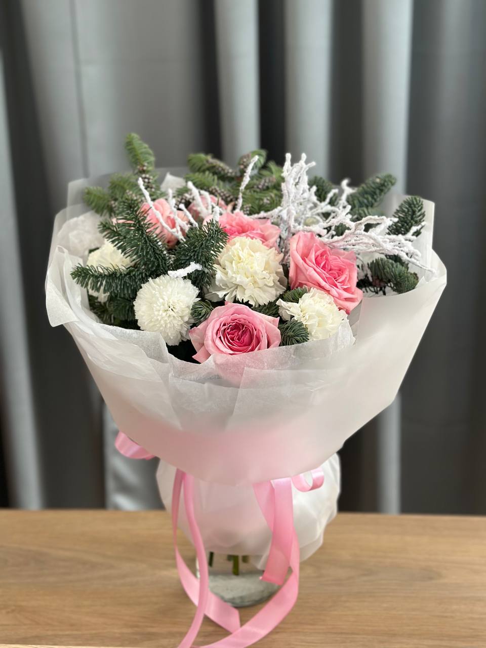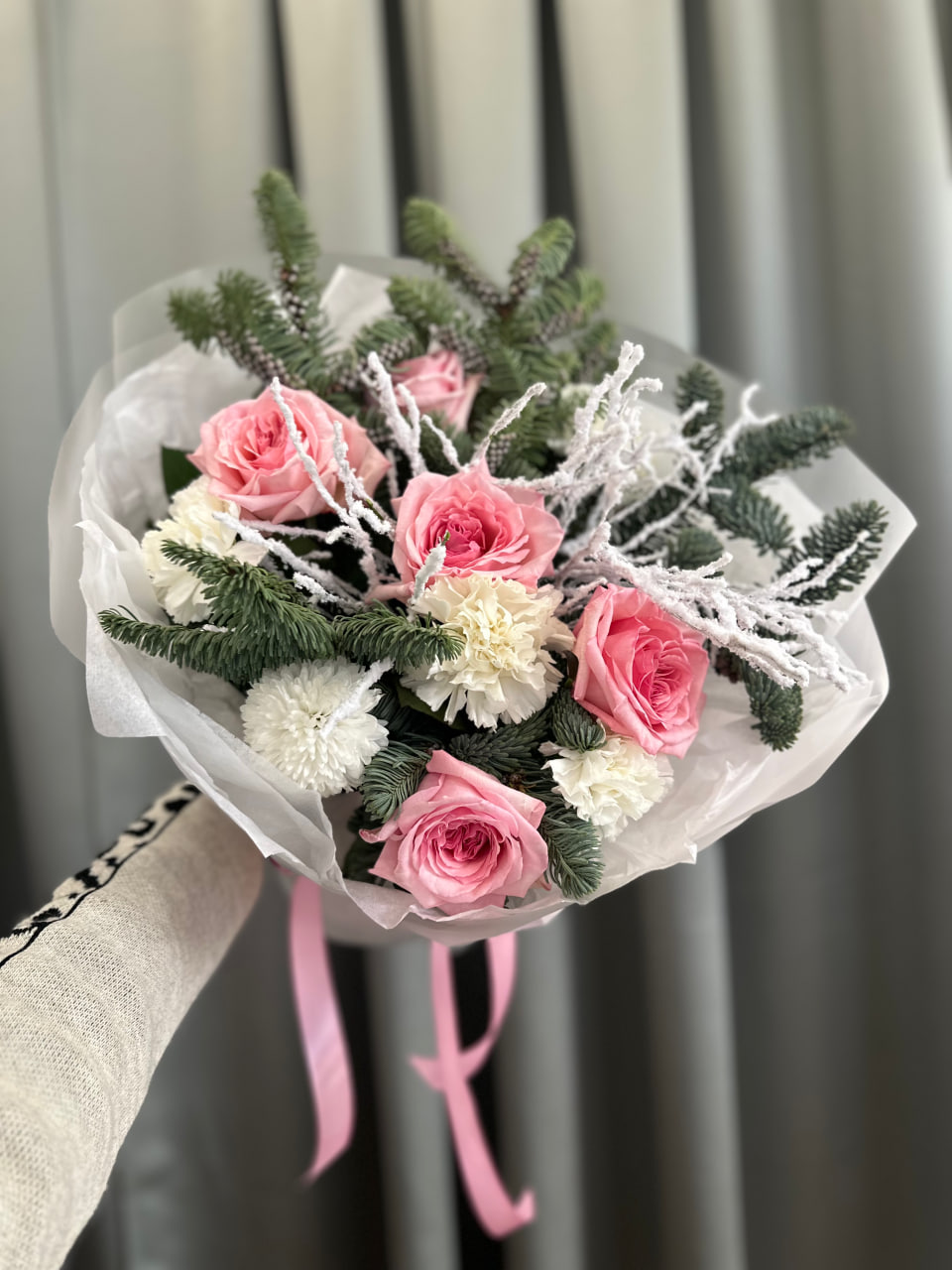 💐 Этот букет воплощает в себе магию зимнего сезона и изысканность природы. Нобилис, с его пышными зелеными иголками, приносит в букете атмосферу зимней сказки. Пионовидная одноголовая роза, с ее нежными и изысканными лепестками, добавляет букету элегантности и романтики. Черничник и гвоздика придают композиции яркость и оригинальность. Этот зимний авторский букет позволит вам почувствовать волшебство зимы и привнести уют в дом. 💐🌹❄️