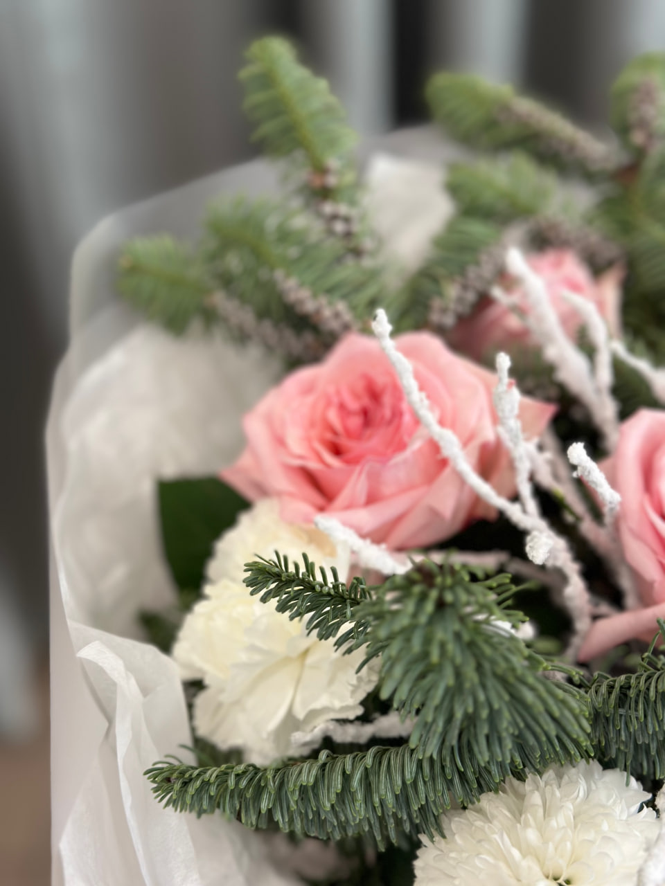 ❄️🌹🍇🌸✨ Отправьте уникальный зимний авторский букет от Blos с нобилисом, пионовидной одноголовой розой, черничником и гвоздикой! ✨🌸🍇🌹❄️
