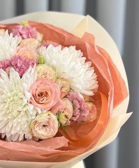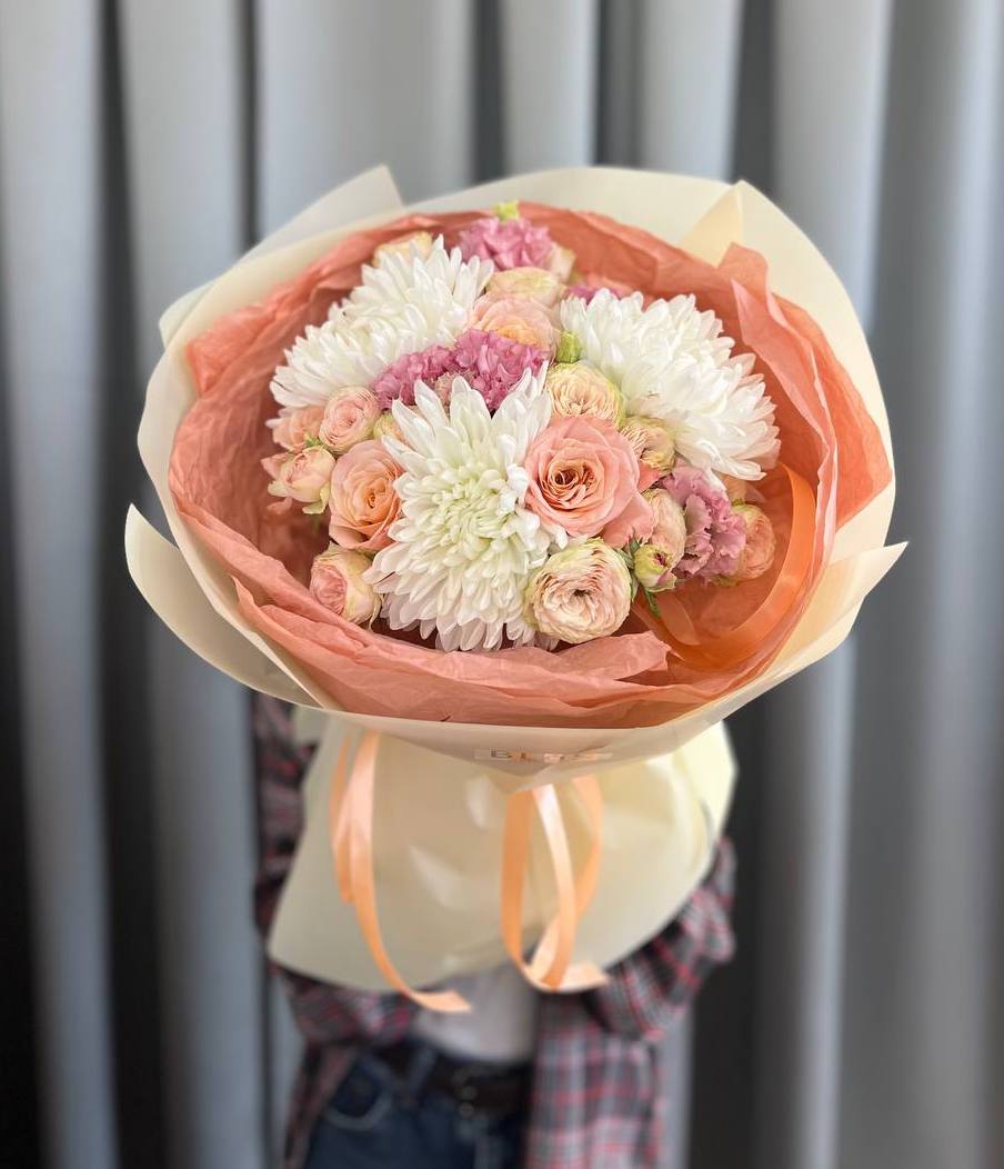 Позвольте себе насладиться эксклюзивным авторским букетом, в котором гармонично сочетаются одноголовые хризантемы, нежные розы и утонченная эустома!