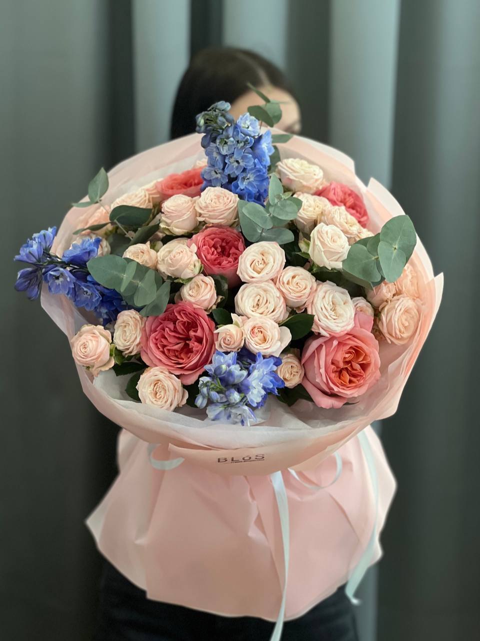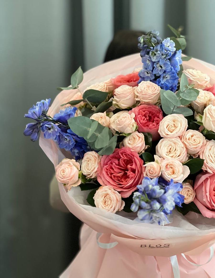 Этот изысканный букет, созданный из пионовидных роз Pink Expression, дельфиниума и кустовых роз, станет настоящим произведением искусства и источником вдохновения 💖
