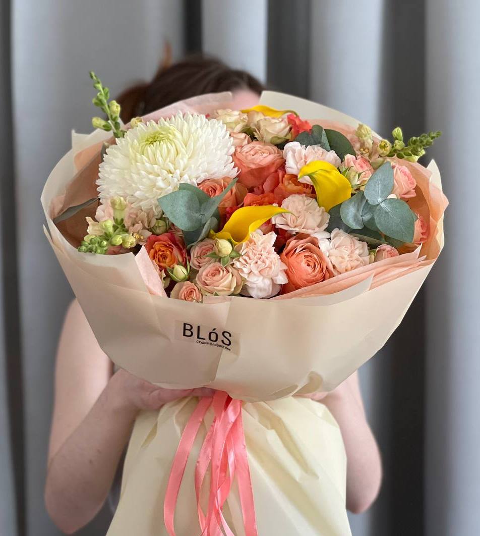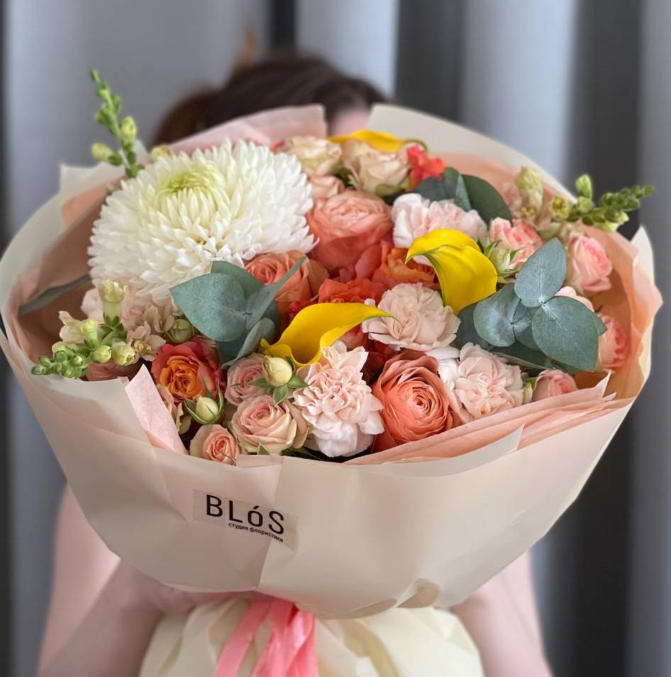 Создайте атмосферу утонченной красоты с нашим авторским букетом, в который вошли одноголовая хризантема, пионовидные розы, диантусы, кустовые розы и элегантные каллы!