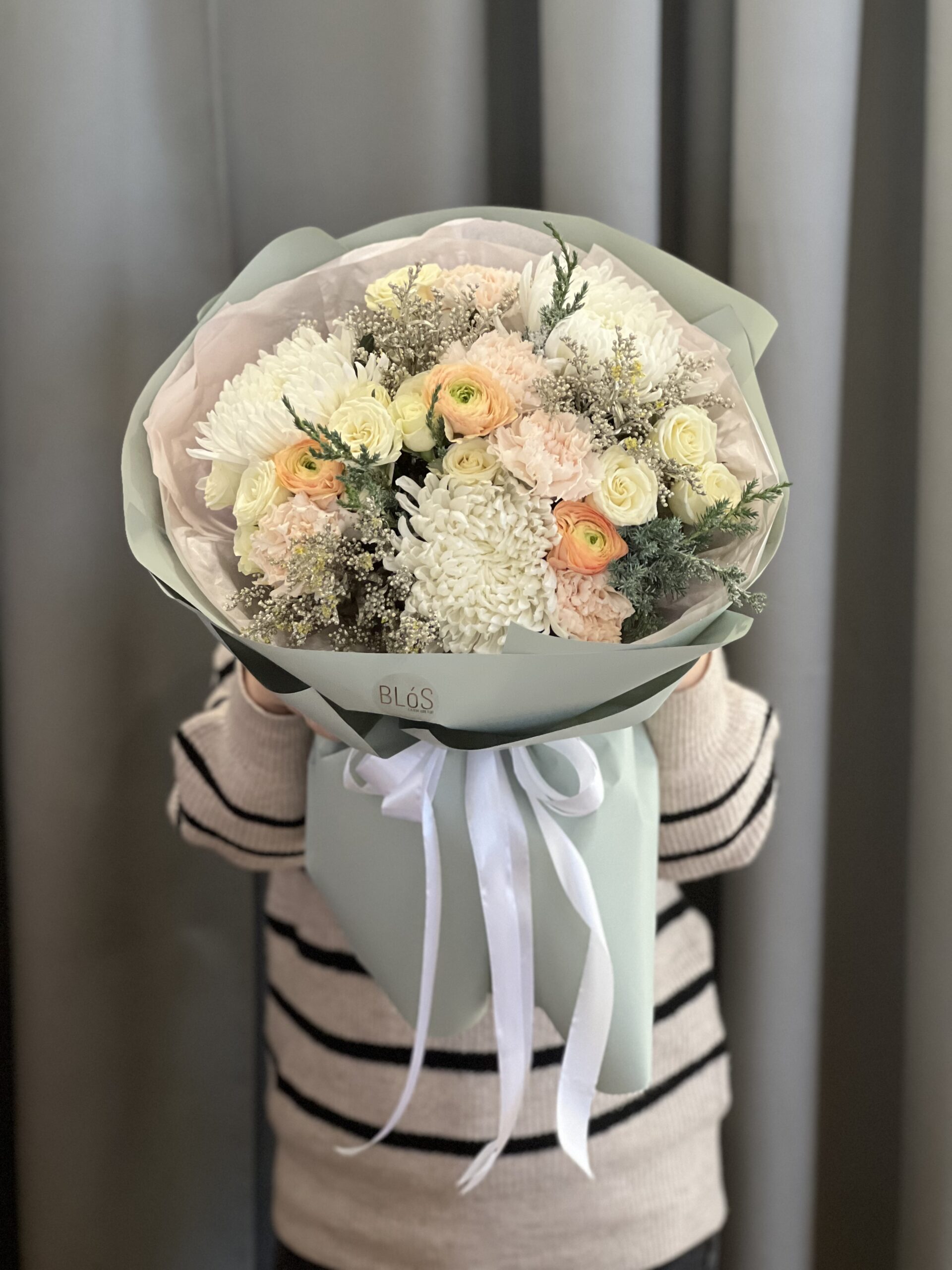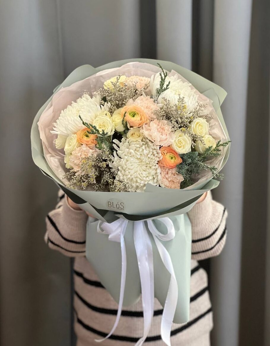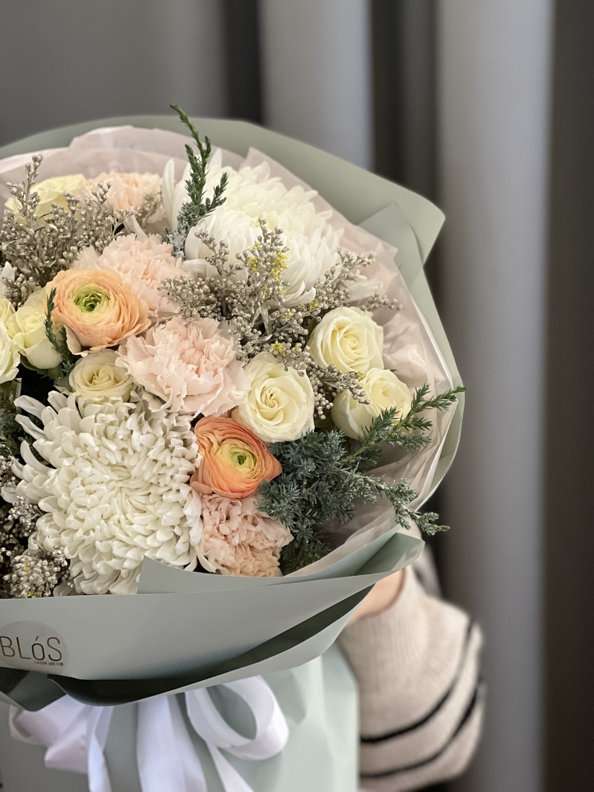 Букет с акцентом на хризантемы смотрится одновременно свежо и благородно: холодная белизна и серебро смягчены тёплыми всплесками ранункулюсов, а хвоя напоминает о стойкости и вечной зелени. Он похож на зимнюю сказку, в которой уже чувствуется дыхание весны.