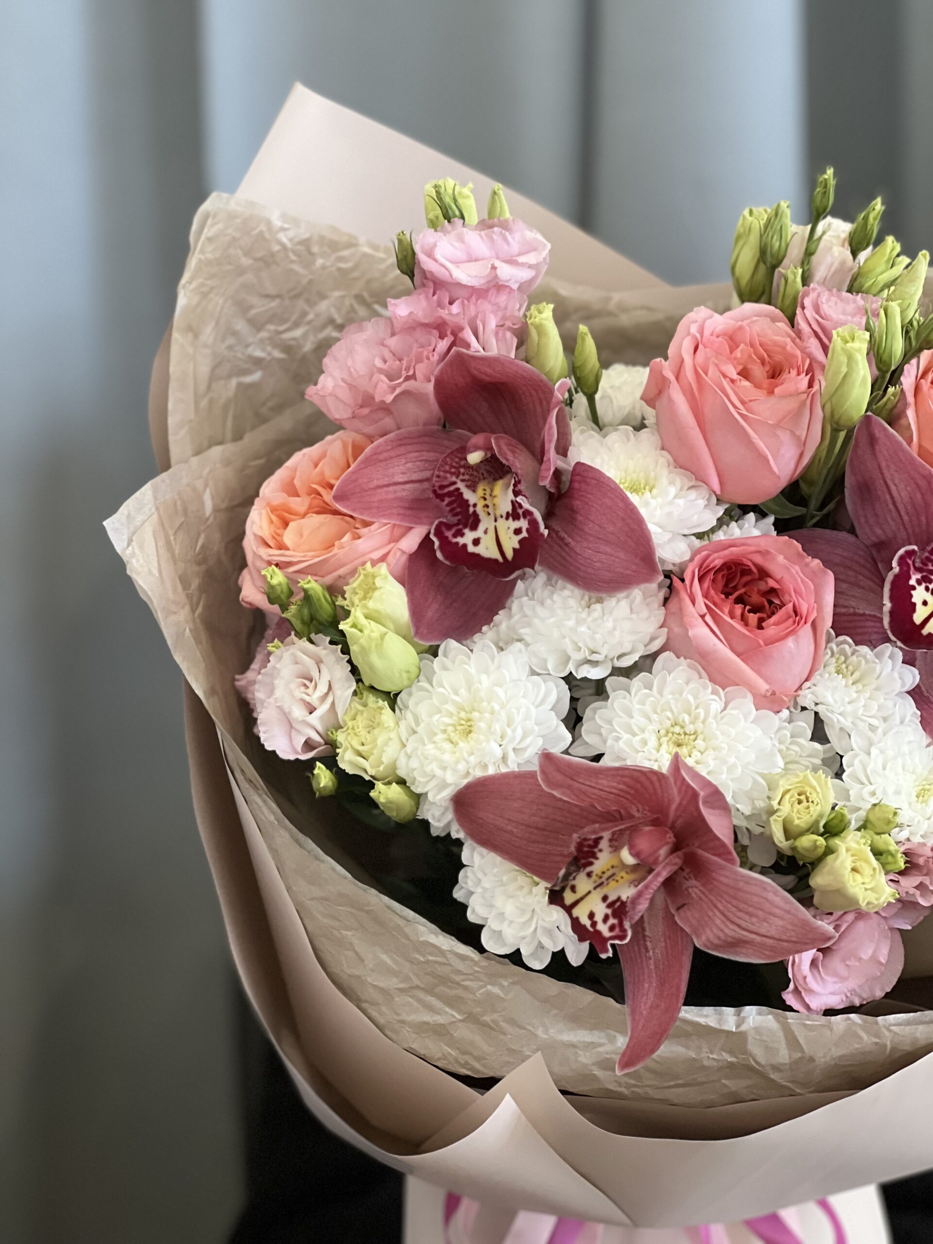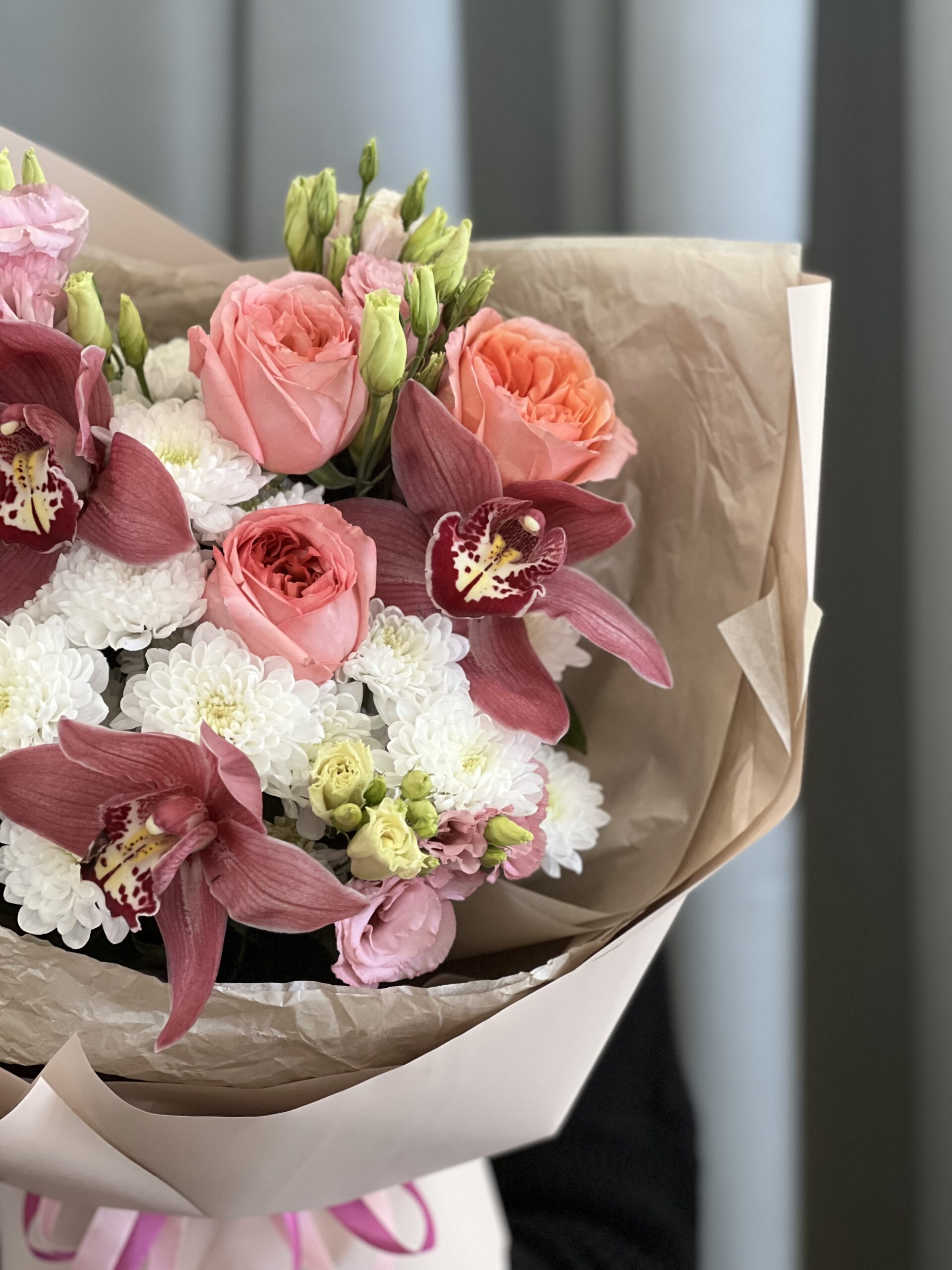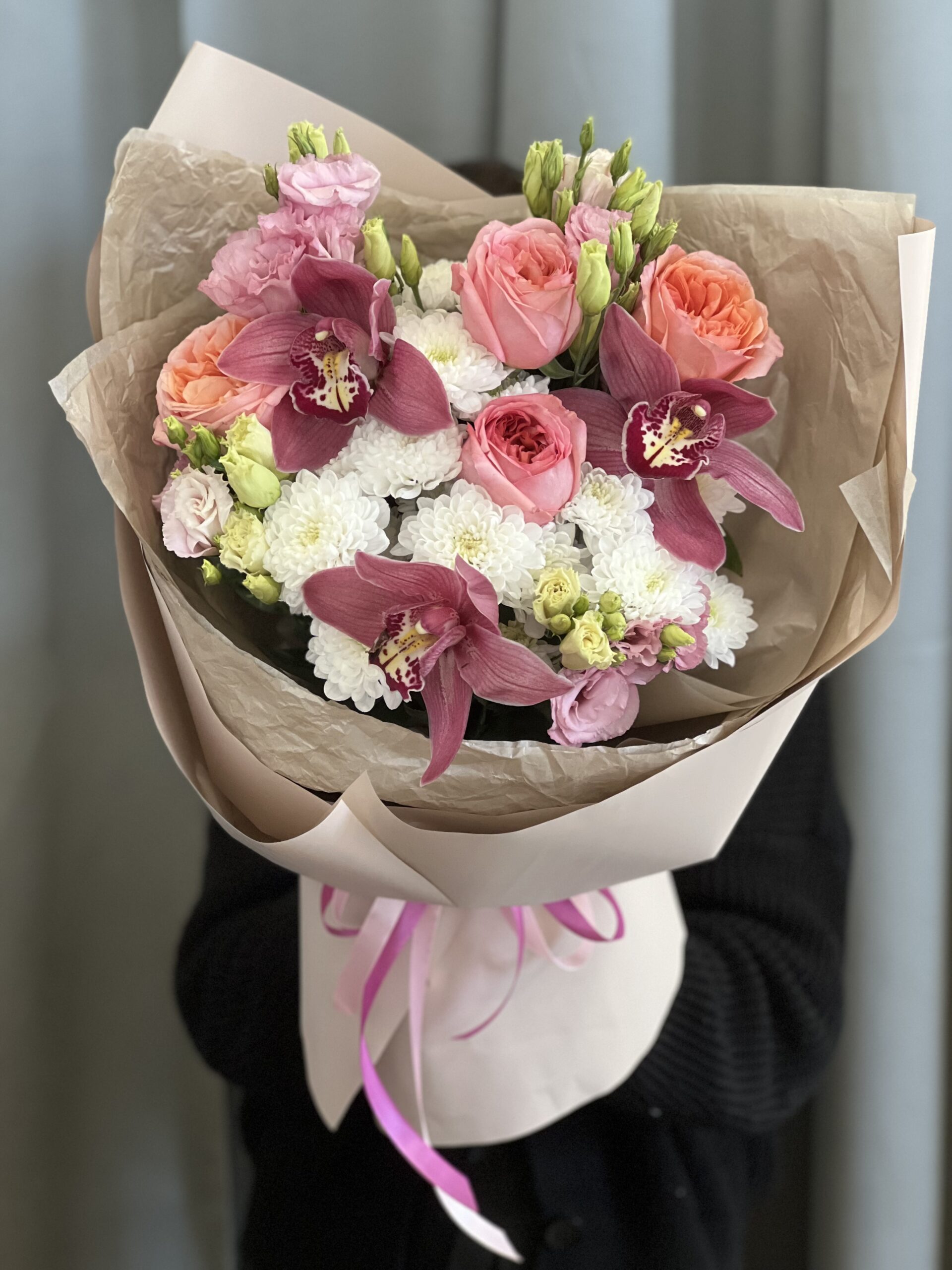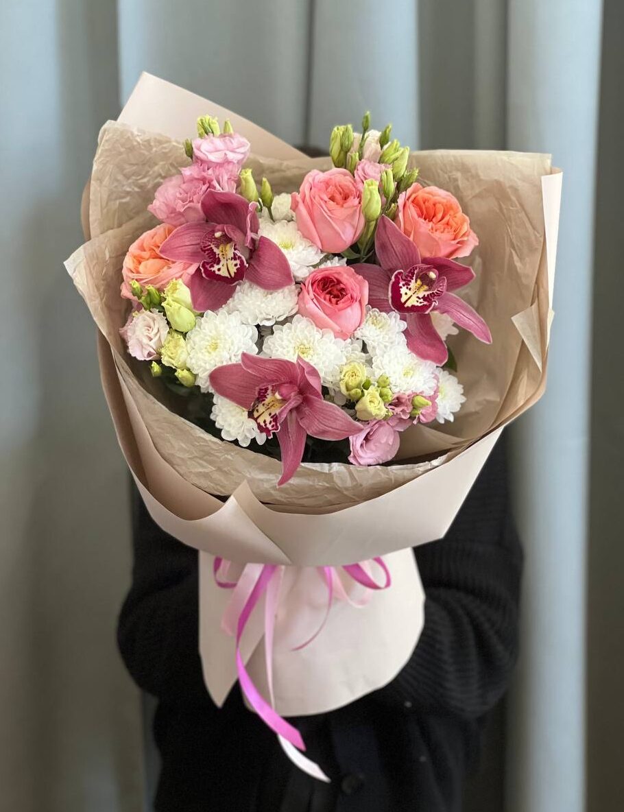 Изысканный авторский букет, где пышная пионовидная роза Pink Expression в дуэте с экзотическими цимбидиумами создаёт гармонию роскоши. Дополненные хризантемой и эустомой, они образуют идеальный подарок для выражения самых теплых чувств.